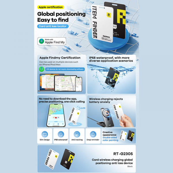 Remax RT-G2305 je praktičan i kompaktan uređaj dizajniran da vam pomogne da u svakom trenutku znate gde su vaši najvažniji predmeti. Zahvaljujući integraciji sa Apple Find My aplikacijom, ovaj uređaj omogućava lako praćenje vašeg novčanika, torbe, ključeva ili ranca – bez komplikacija.